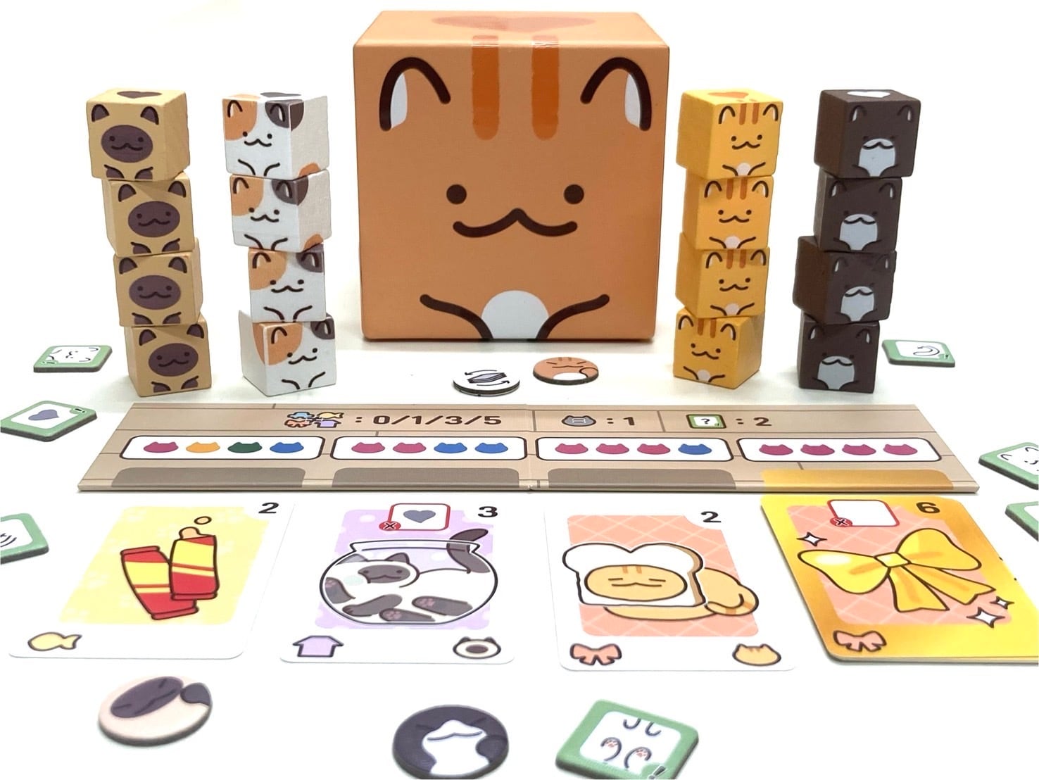 手番では猫の絵柄のサイコロを振り、出た目に応じたカードを集めていくセットコレクション系のゲームです。最後に振った個数より少ない個数のダイスを振り直すことができます。獲得できるカードがなければ、山札から魚の骨カードを受け取ります。