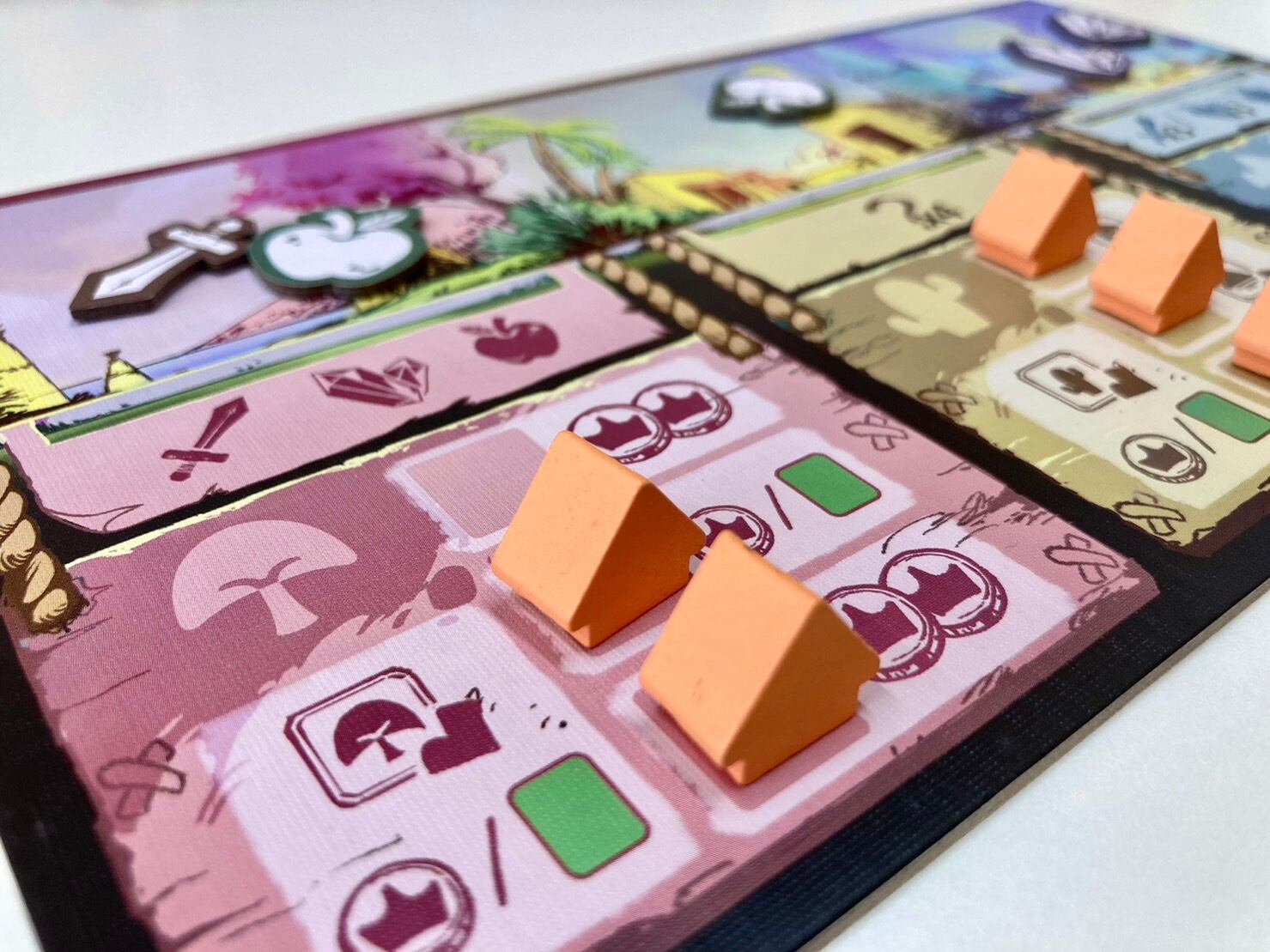 中国のクラウドファンディングサイトで84,186.32元(約160万円)を調達したゲームです。手番でやることは、チップを袋から2枚引いて1枚選ぶか、場に置かれているチップを任意で選ぶか。選んだチップと同色のカードを1枚選び、大陸の探検や交易品の獲得などのアクションを行います。カードのファンタジックな絵柄やプレーヤーごとにユニークなかわいらしいコマが特徴的ですが、ゲーマー好みの強烈なジレンマに悩まされることでしょう。